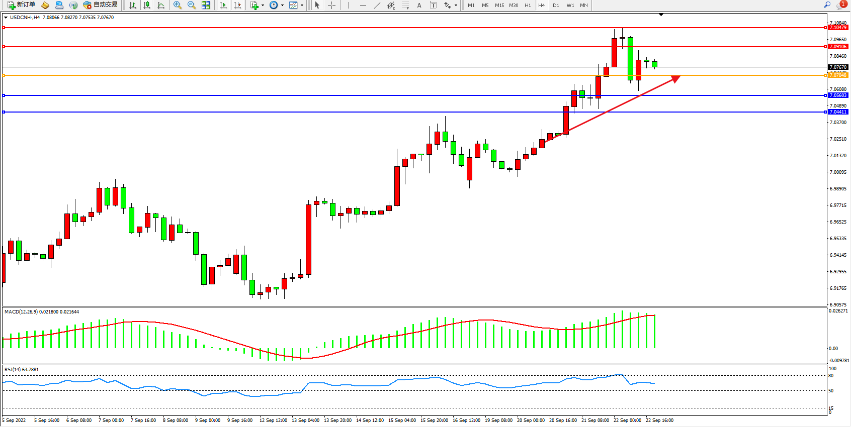 美元人民币USDCNH——4小时K线图显示:
