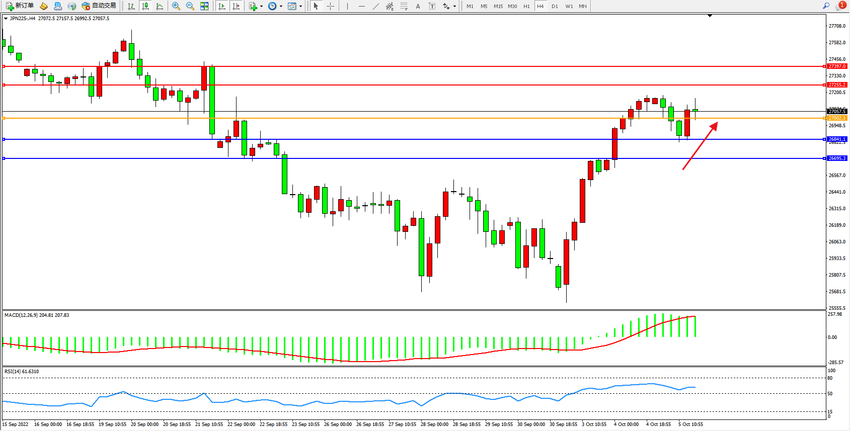 日经225指数10月5日(周三)收盘上涨131.29点,涨幅0.49%,报27123.50点。日本首相岸田文雄:具体的货币政策措施应该留给日本央行。日本经济正在缓慢复苏。近期的风险包括对全球经济放缓的担忧。