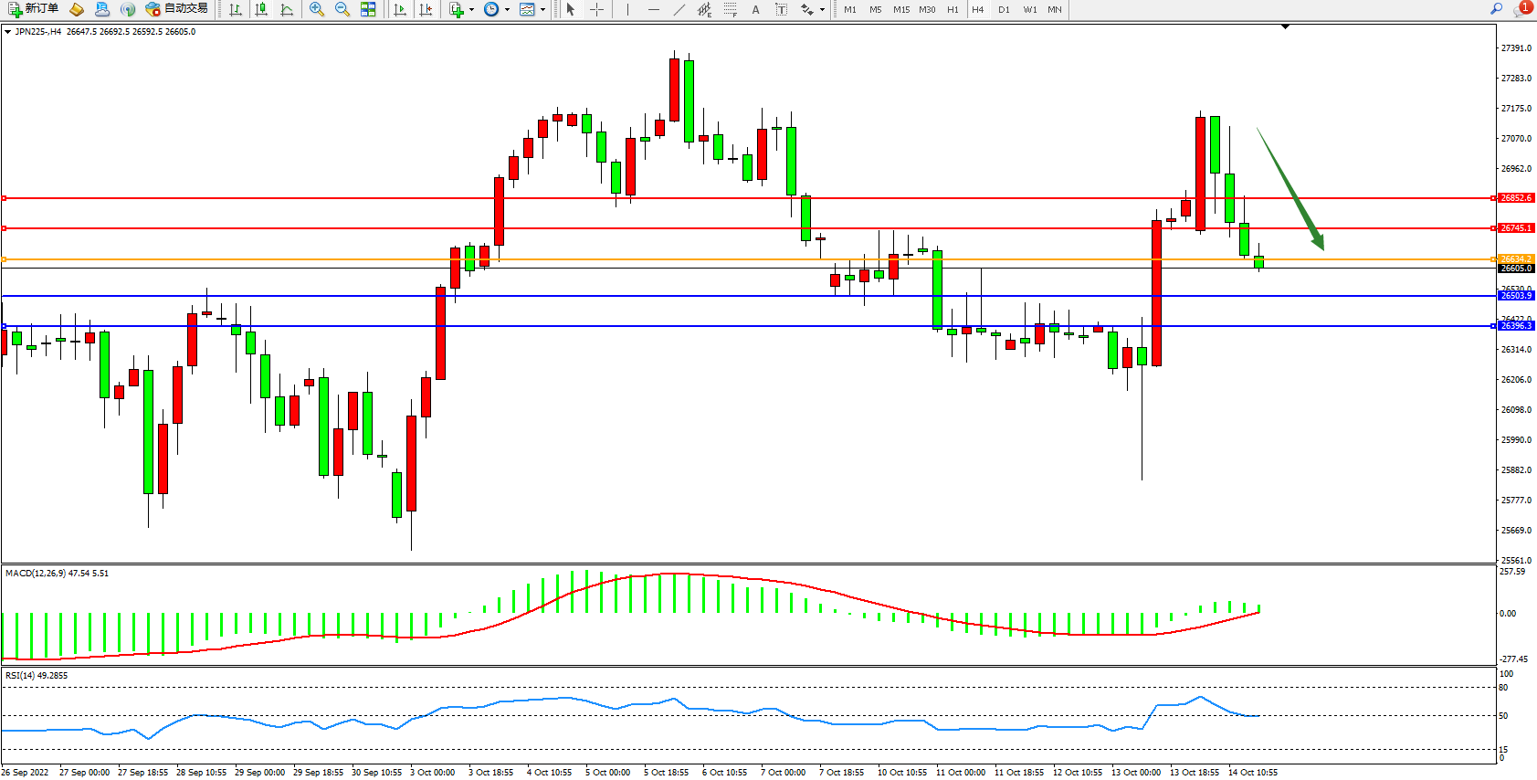 日经225指数10月14日(周五)收盘上涨887.58点,涨幅3.38%,报27125.00点。日本9月核心消费者通胀率可能创下八年来的新高,因为企业试图通过涨价来抵消原材料成本高企和日圆下滑的压力。