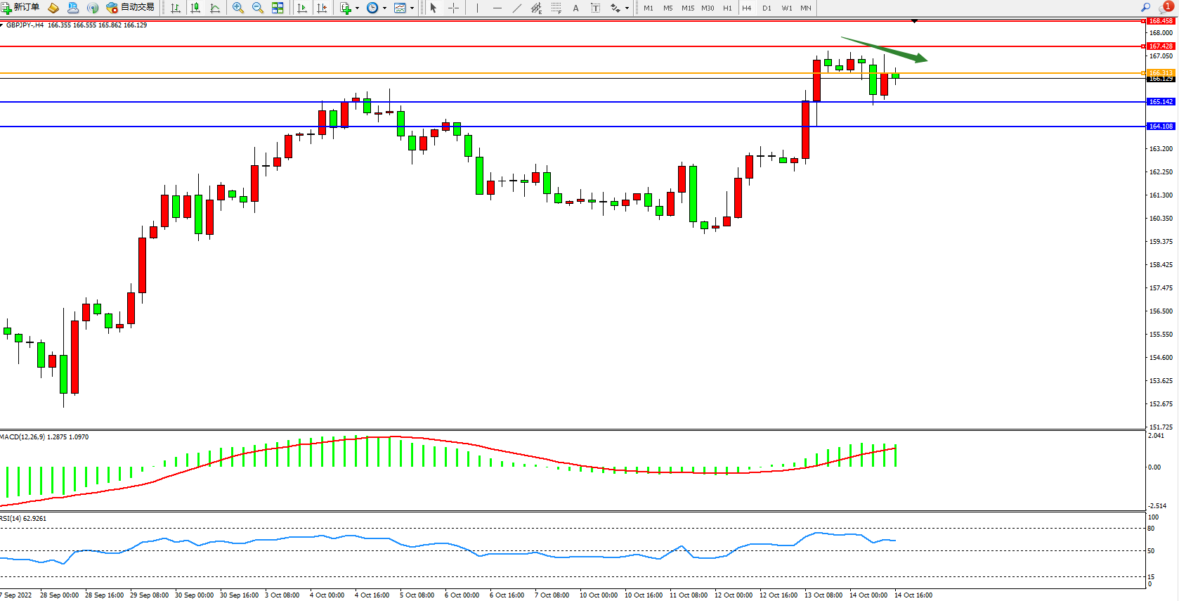 备选策略:166.313上方看涨,目标167.428、167.458