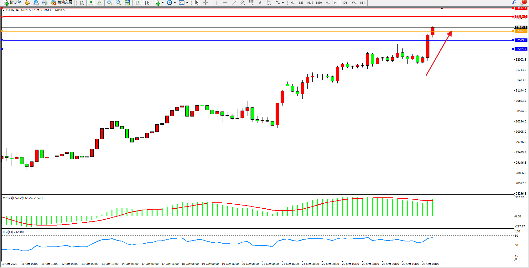 道琼斯指数10月28日(周五)收盘上涨828.52点,涨幅2.59%,报32861.80点;美国核心PCE通胀回升,消费者支出表现出弹性。美国通货膨胀的一个核心指标在9月份加速增长,同时消费者支出保持弹性,这表明价格压力和强劲的需求强化了美联储下周再次大幅加息的理由。
