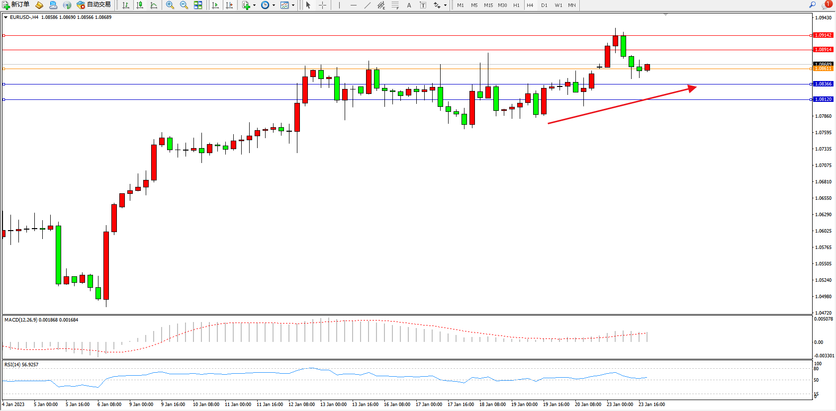欧元美元EURUSD—4小时K线图显示: