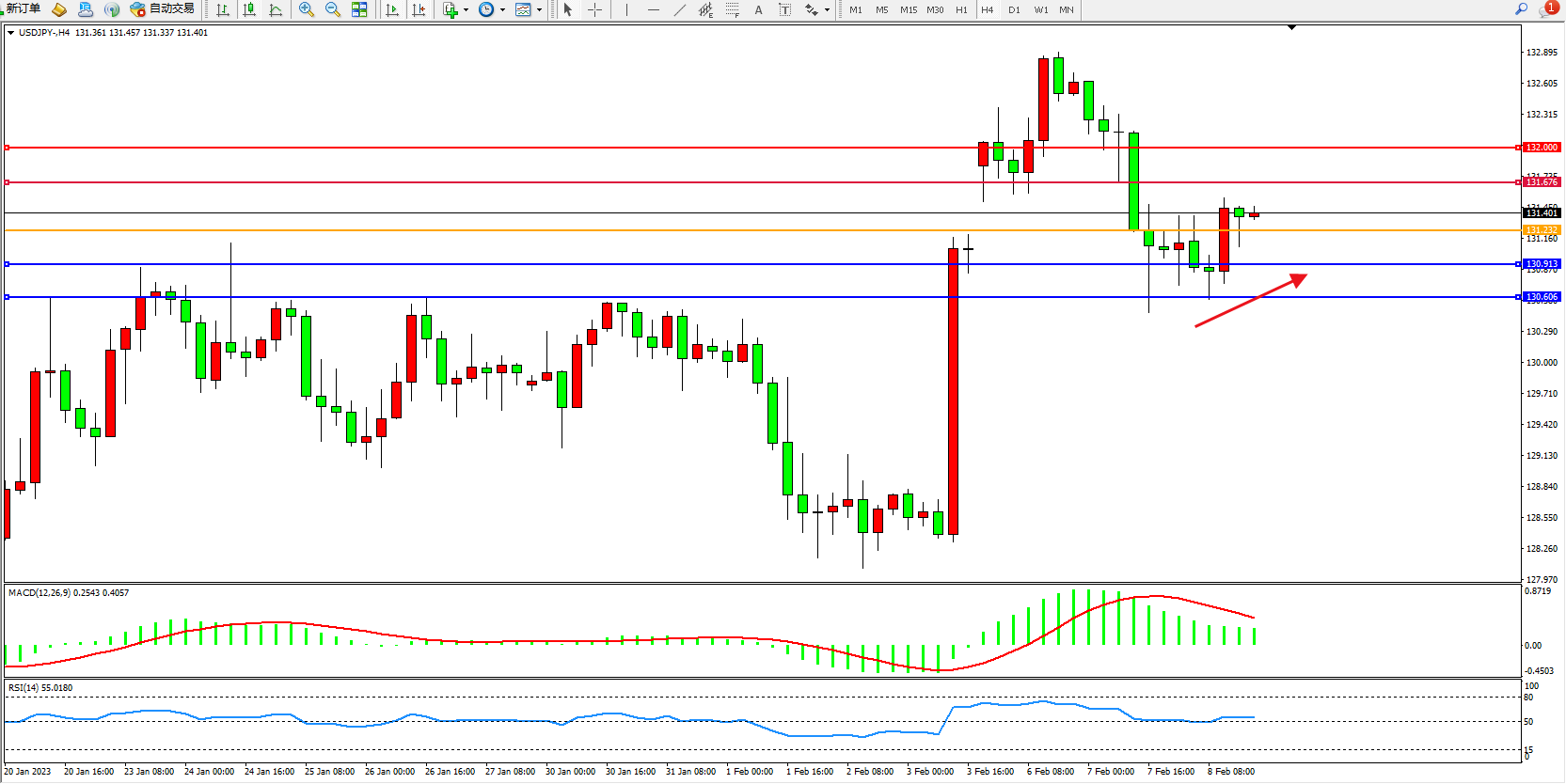 4小时图看:高位空头动力震荡下行后,短期窄幅整理,多头动力有伺机入场迹象,MACD指标处于多头区域维持整理,RSI指标处于50均衡线上側弱势徘徊;