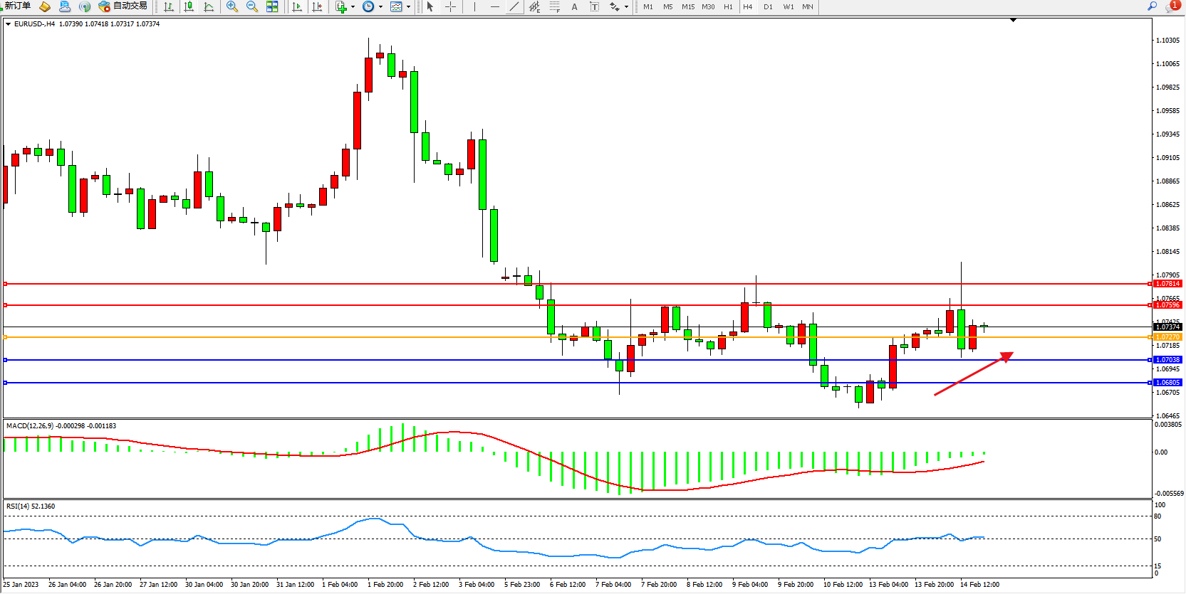 欧元兑美元维持1.07374附近震荡,欧盟经济预期报告:欧盟委员会将2023年欧元区经济增长预测从之前的0.3%上调至0.9%,将2023年欧元区通胀预测从之前的6.1%下调至5.6%。 欧洲央行副行长金多斯:3月以后加息幅度取决于数据。