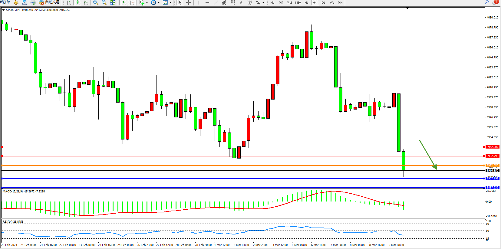 标普500指数3月9日(周四)收盘下跌72.31点,跌幅1.81%,报3919.70点;美国上周初请失业金人数高于预期,录得21.11万人,此前该数据已经连续七周录得少于20万人。高于预期的失业人数缓解了市场对就业市场火热,并将推动美联储转向鹰派的担忧。