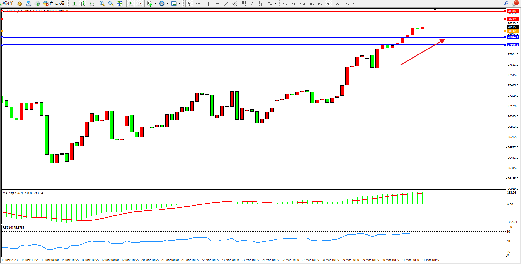 日经225指数3月31日(周五)收盘上涨260.57点,涨幅0.94%,报28043.50点。日本首都东京的核心消费通胀率在3月连续第二个月放缓,但仍远高于央行的2%目标,凸显出这一世界第三大经济体的物价压力扩大。