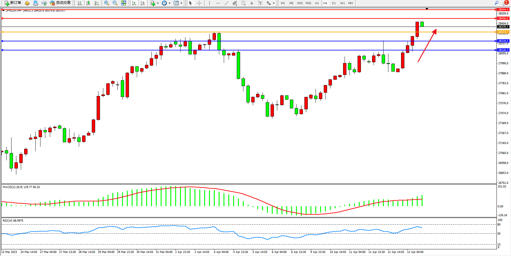 4小时图看:高位持续震荡上扬,短期看涨情绪依旧,市场多头不断向上移动中,MACD指标处于多头区域徘徊,RSI指标处于多头区域震荡上移;