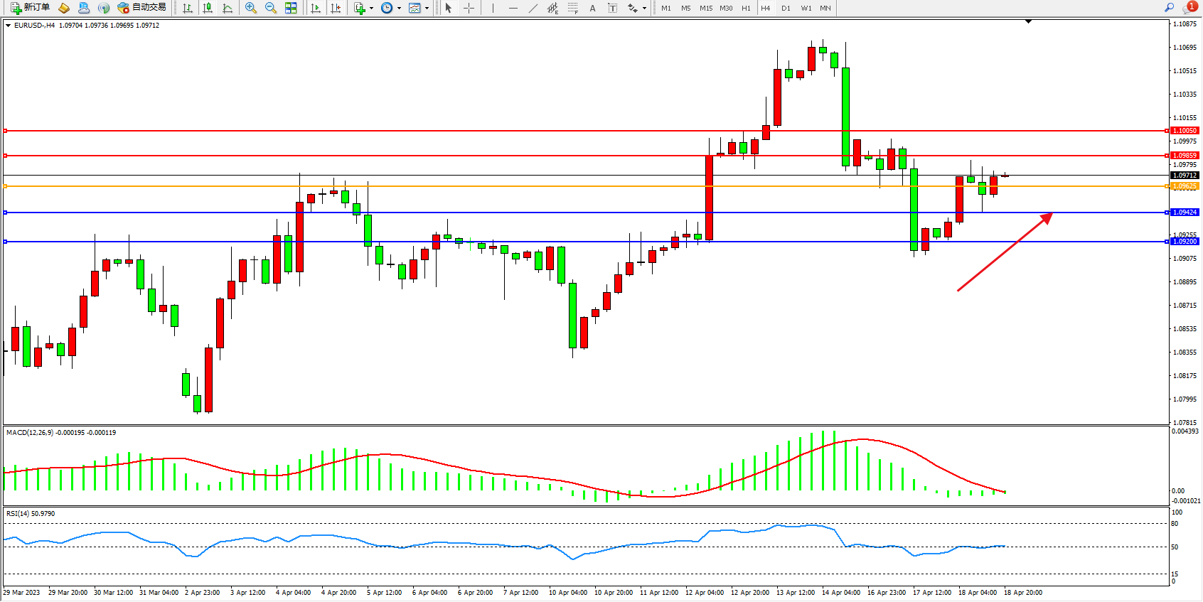 欧元美元EURUSD—4小时K线图显示: