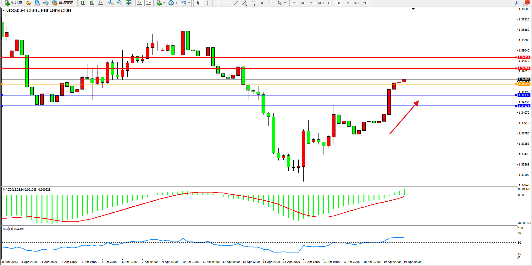 4小时图看:多头动力维持震荡上扬,短期看涨情绪笼罩,多头动力有继续攀升态势,MACD指标处于0轴线上側持续上行,RSI指标处于多头区域整理;