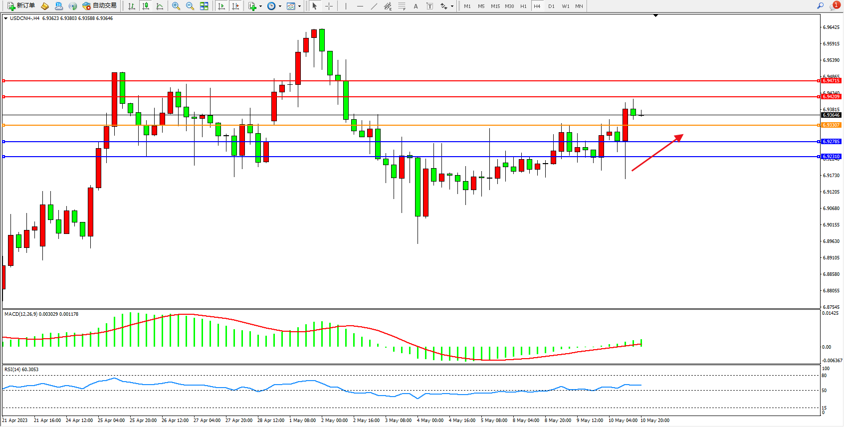 美元人民币USDCNH——4小时K线图显示: