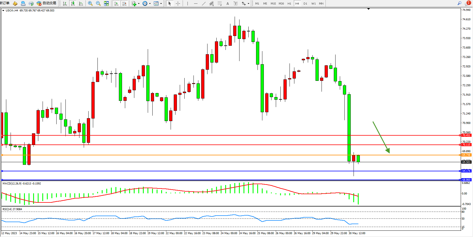 交易策略:69.748下方看跌,目标69.176 68.860