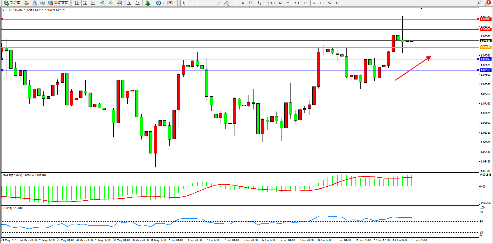 欧元美元EURUSD—4小时K线图显示: