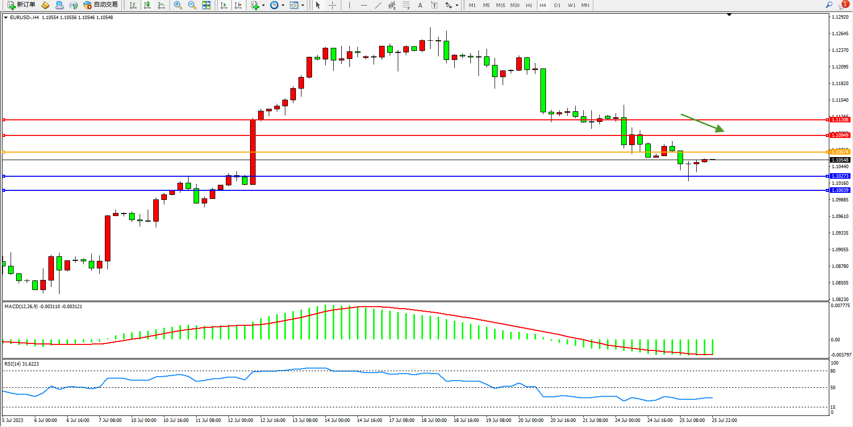 欧元美元EURUSD—4小时K线图显示: