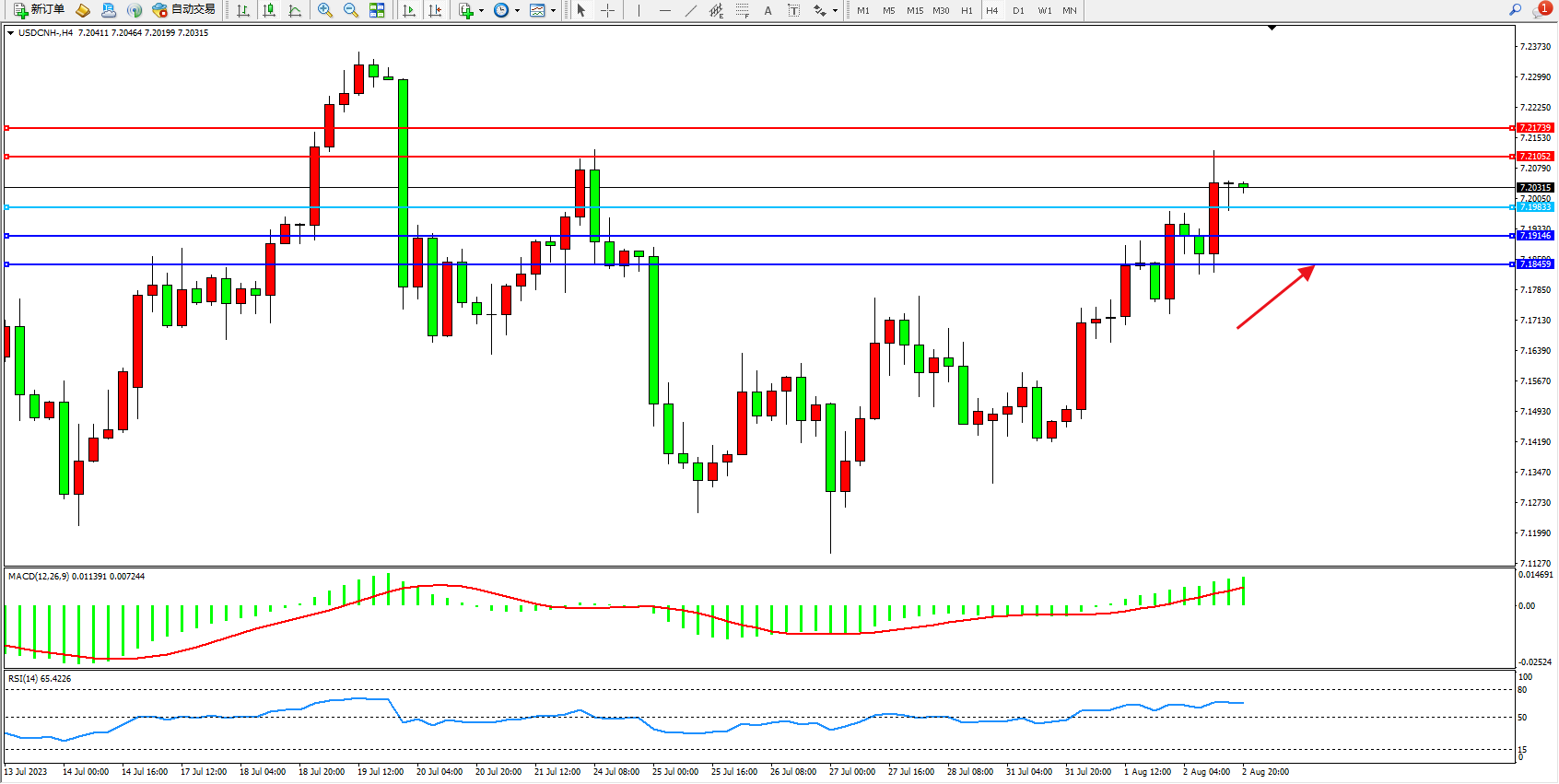 交易策略:7.19833上方看涨,目标7.21052  7.21739