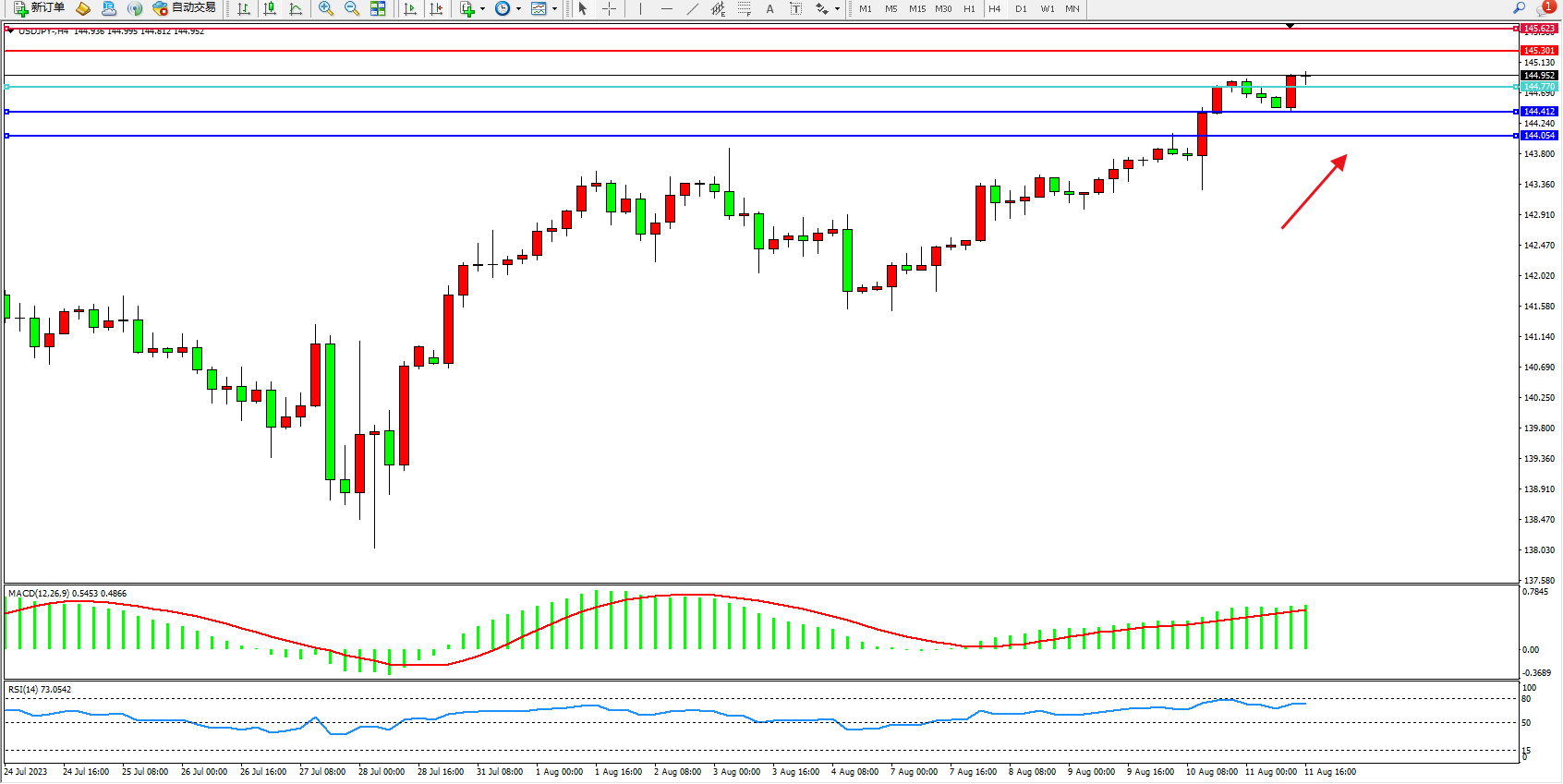 4小时图看:高位多头动力维持震荡上移,短期看涨情绪笼罩,市场多头不断攀升中,MACD指标处于多头区域高位整理,RSI指标处于多头区域高位徘徊;