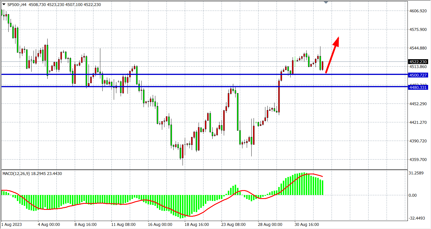 4小时图看,标普虽有所回落但仍维持在4500之上,MACD量能维持在零轴上,行情多头格局不变,继续支撑关注4500-44800附近,上方阻力看4550-4580。