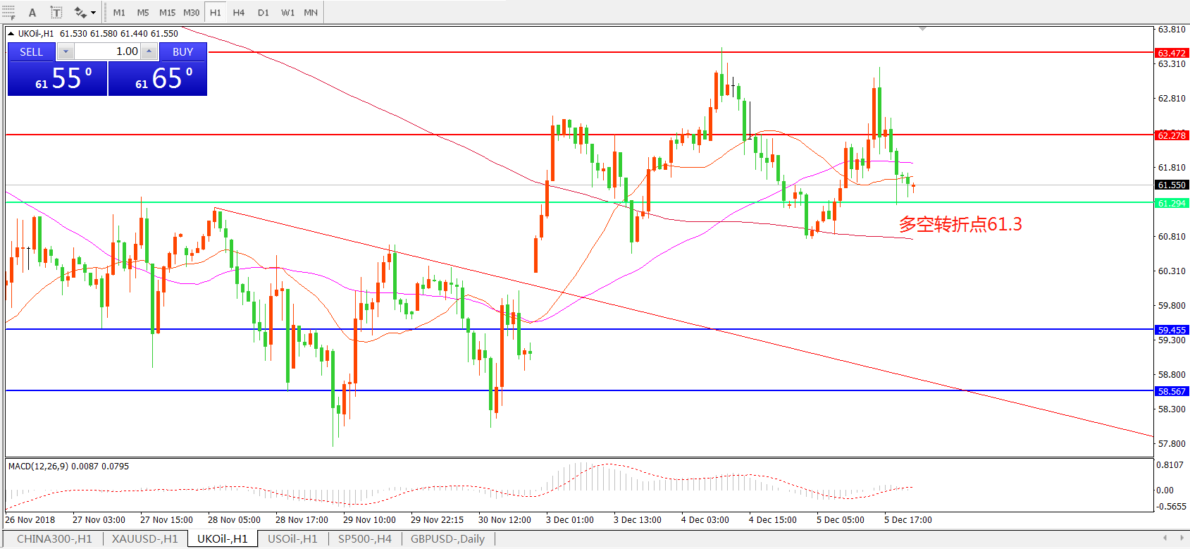 小时图看,油价跳空高开后出现回落,形态上形成箱体震荡的概率较大,短期均线走平,MACD红柱缩短,短期关注下方支撑61.3一线。