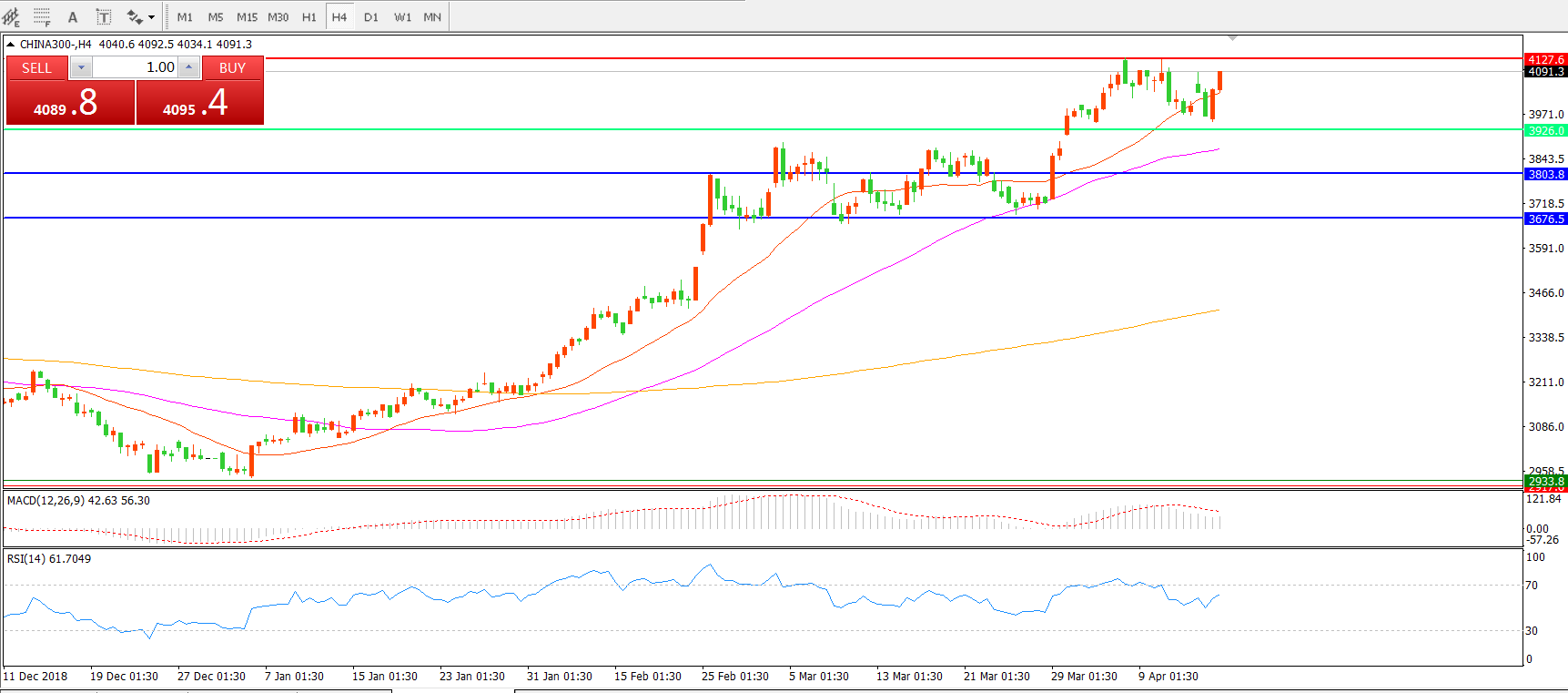4小时图看,中华指数强势反弹,之前跌幅基本被收复,短期走势偏强,日内重点关注上方4127一线阻力。 均线系统呈多头排列,MACD红柱减少,RSI指标拐头,日内延续震荡概率较大。