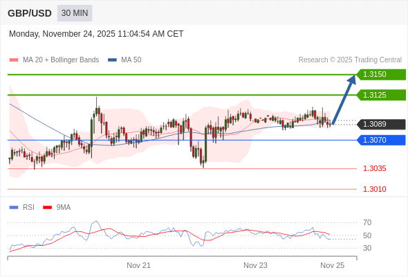 在 1.3070 之上,看涨,目标价位为 1.3125 ,然后为 1.3150 。