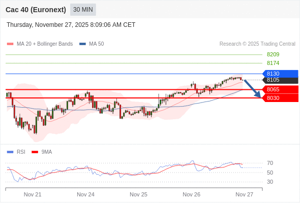 法国CAC指数期货 (Euronext) (Z5) 当日内: 短期关键阻力位在8130。