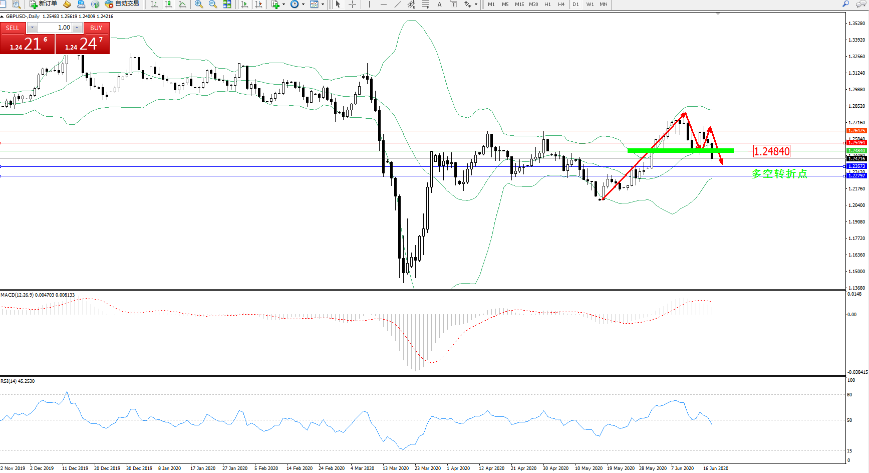 交易策略:1.24840下方看跌,目标1.23573、1.22797