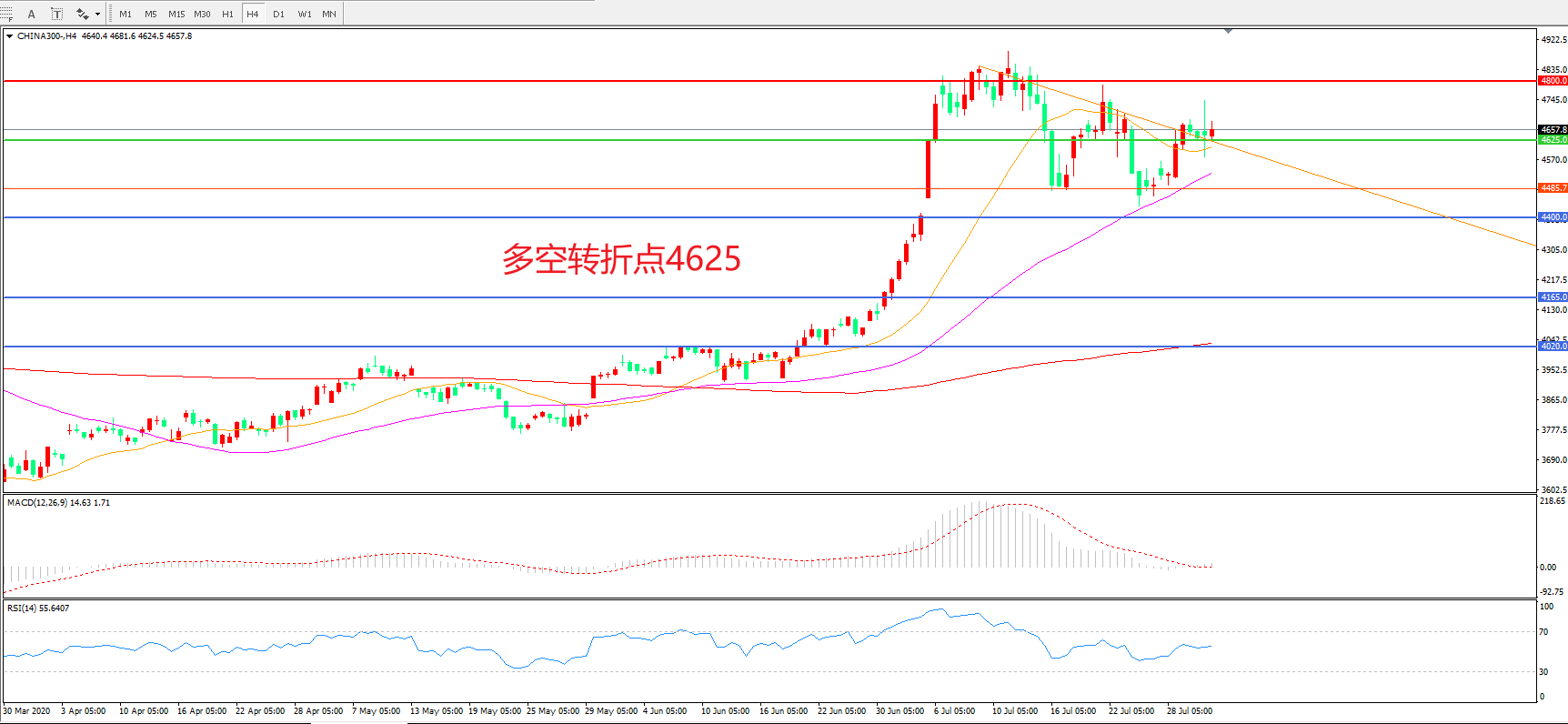 4小时图看,沪深300冲高回落,短期走势有所放缓,但三角形整理有突破站稳迹象,短期均线拐头向上, MACD红柱缩短,RSI指标走平,日内延续震荡概率较大。