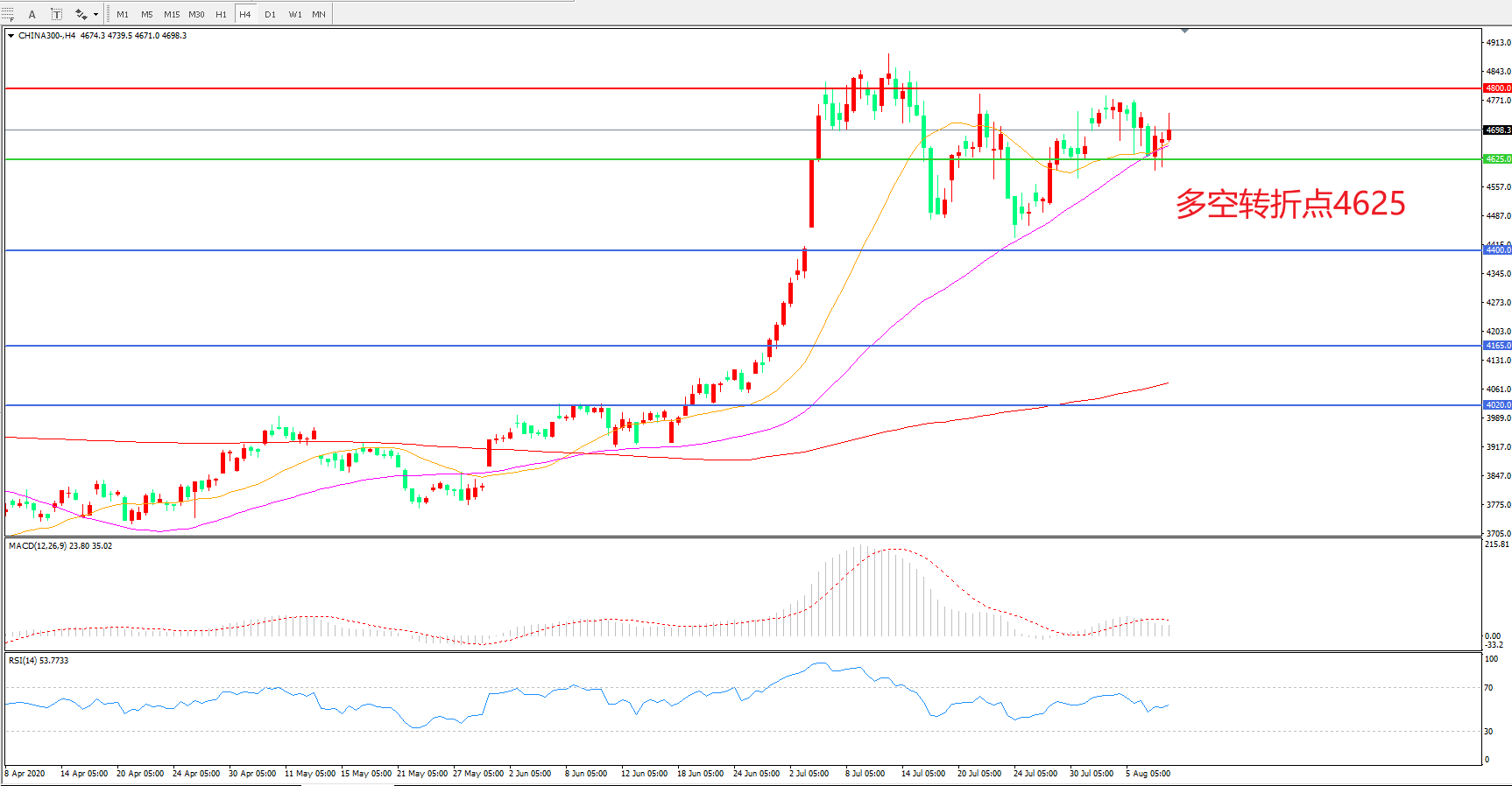 4小时图看,沪深300延续高位震荡,4625成为短期支撑, 均线系统逐渐粘合, MACD红柱缩短,RSI指标向上,日内延续上行概率较大。