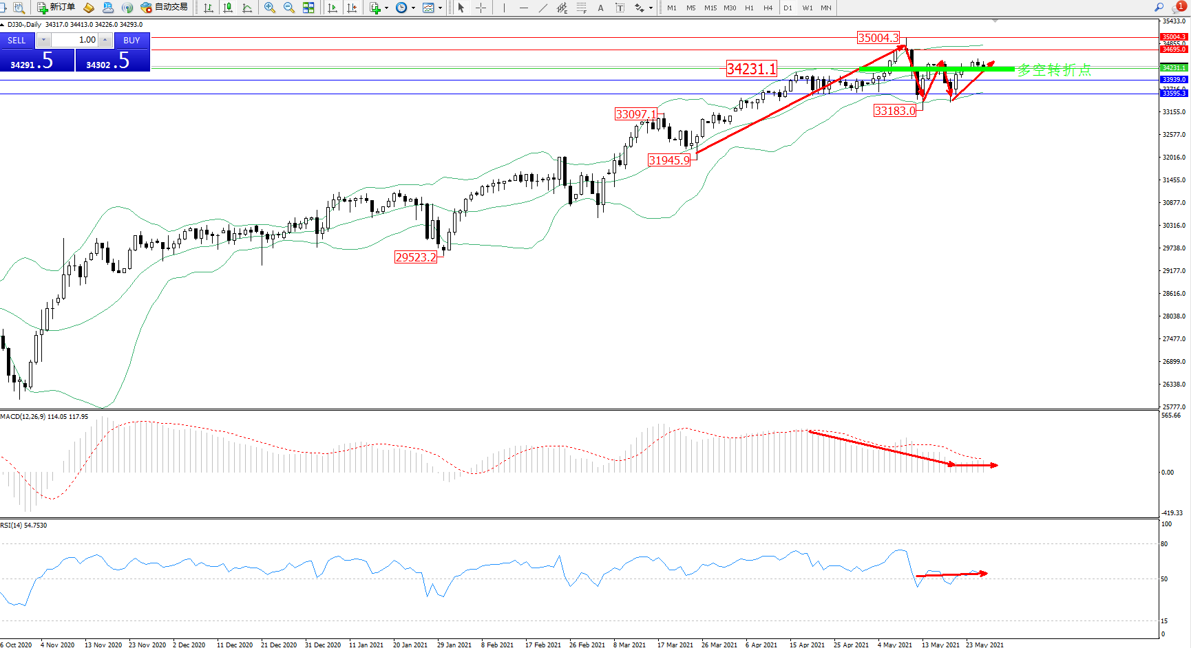道琼斯指数5月26日(周三)收盘上涨10.26点,涨幅0.03%,报34322.72点; 美联储理事夸尔斯阐述了对美国经济的乐观展望,认为近期通货膨胀率升至2%以上是暂时的,尽管上行风险可能会持续较长的时间。夸尔斯说:“如果我对未来几个月经济增长,就业和通货膨胀的预期得到印证,尤其是如果它们的表现强于预期时,那么正如上一次FOMC会议纪要中所指出的那样,对于美联储来说,在后面几次会议上讨论调整资产购买计划将变得至关重要”。