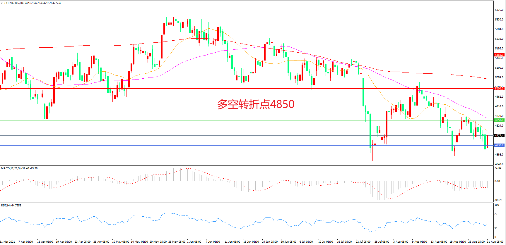 周二(8月31日),两市股指集体低开,沪指一度大幅跳水,午后银行、券商板块发力助力沪指翻红,沪深300探底回升,收报4777.4点。两市合计成交14821亿,北向资金净买入61.47亿元。从上周三开始,沪深300就受制于21周期均线不断下行,昨日有券商助力躲过一劫,接下来就要看指数能否借助大金融的力量成功打破桎梏。