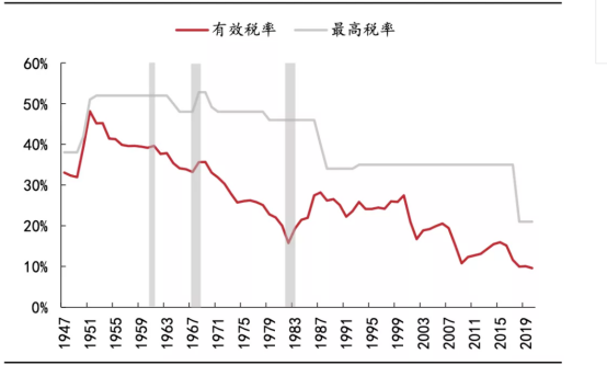 1950 年以来,美国企业税率多次下调,仅在 1968 年发生了一次大幅上调,而这次加税也伴随着流动性的收紧造成了 1968-1971 年间标普 500 指数下跌 36.06% 的熊市。