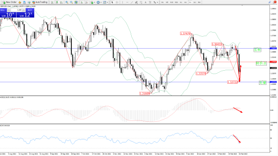 空头动力急速下挫,低位跌至1.32722附近节点后快速回升,但整体市场下行态势良好,短期或有进一步下行潜力,布林带指标呈张口走势持续中,上方压制关注1.36001附近,低位支撑关注1.32722附近,关注1.34689附近转折点,MACD指标空头动力维持震荡下行至0轴线下方徘徊,RSI指标处于50均衡线下侧强势下挫中,如图: