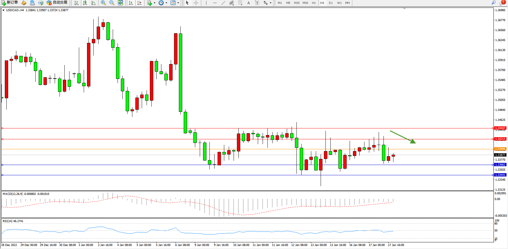 4小时图看:低位短期维持款宽幅震荡,市场整体处于篇弱势,MACD指标处于低位震荡中,RSI指标处于50均衡线下侧附近徘徊;