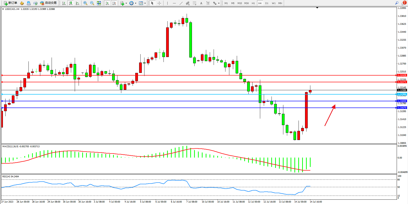 4小时图看:低位多头动力强势攀升,短期看涨情绪笼罩,市场多头不断拉升中,MACD指标处于空头区域震荡上移,RSI指标震荡上移至50均衡线上側徘徊;